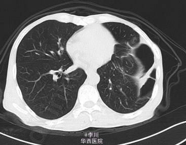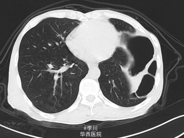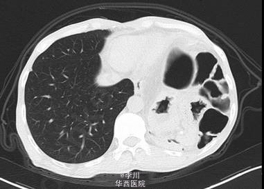 在全麻下经左胸膈疝修补、胸膜粘连烙断、胸腔闭式引流术。术中发现:左膈肌外侧缺损约15cm×12cm大小,腹腔内网膜、胃及横结肠等组织疝入胸腔。网膜、胃、结肠组织与膈肌、胸壁片状粘连。左侧肺与胸壁广泛粘连。术后予抗炎、化痰、对症等治疗后好转。