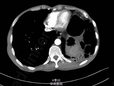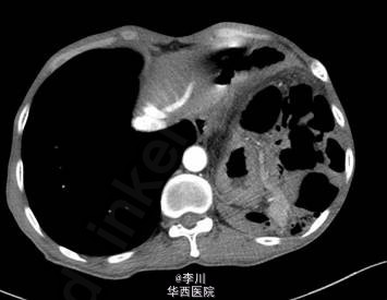 既往患者1+年前因摔跤撞伤腹部,于贵阳医学院行“脾切除+膈疝修补术”。查体左肺呼吸音减弱,可问及异常肠鸣音。CT提示:左侧膈面上抬、局部膈肌软组织似不连续,可见胃及部分肠管上移,膈疝?