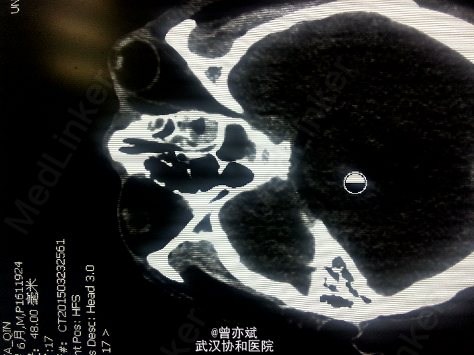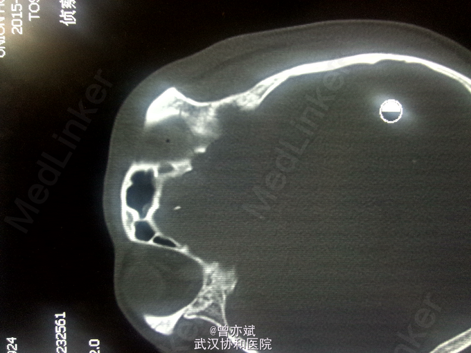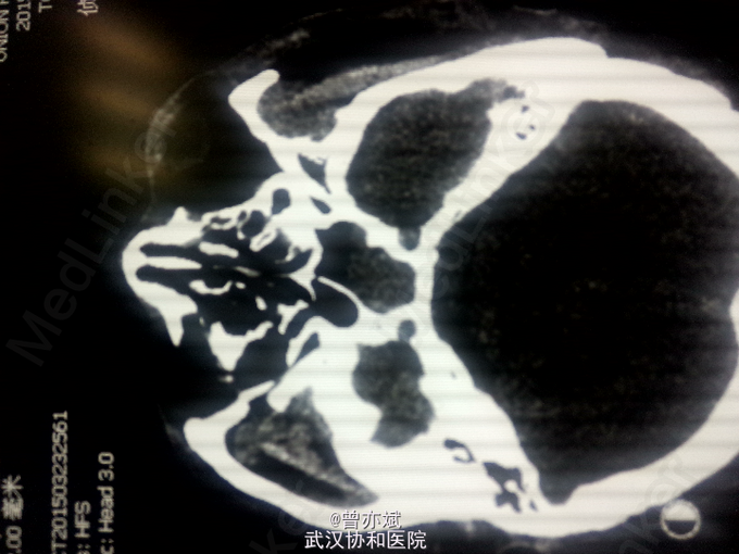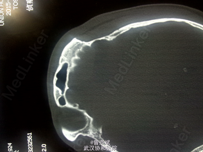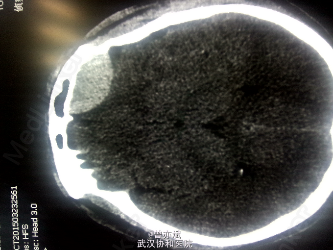 查体:T 36.9℃,P 70次/分,R 20次/分,BP 128/82mmHg,查体不合作,神志浅昏迷,营养发育良好,皮肤及淋巴结未及明显异常,头颅大小正常,无畸形,头发分布正常,左额部软组织损伤,心肺腹未及明显异常。双下肢无水肿,生理反射存在,病理反射未引出。 专科查体:神志浅昏迷,GCS评分3+3+4分,左侧瞳孔直径6mm,对光反射消失,右侧瞳孔直径4mm,对光反射存在,四肢肌力2级,生理反射存在,病例反射未引出。 辅助检查:外院及我院急诊CT示左侧额部硬膜外血肿。急诊CT:1、左侧额部硬膜外血肿,厚度为23mm;2、少量蛛网膜下腔出血;左侧额骨线性骨折累及左侧眶顶、内侧壁及眶突,左侧眼眶内侧壁局部凹陷,考虑为外上性改变,左侧筛窦积液、积血、蝶窦积液。