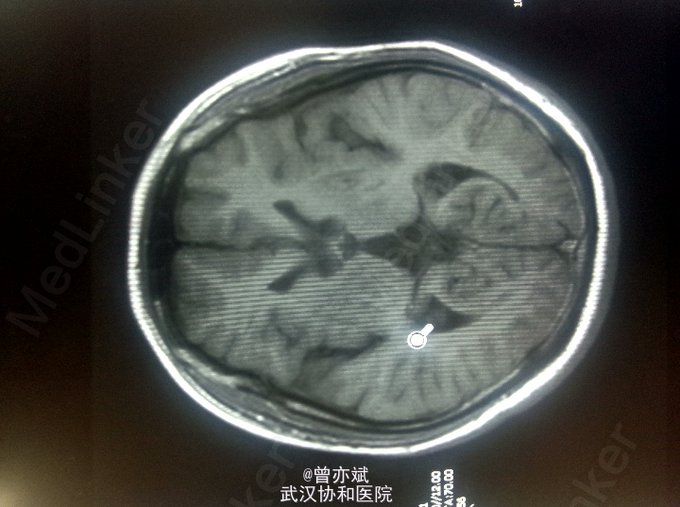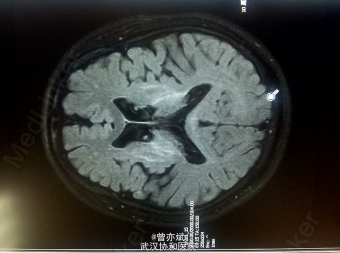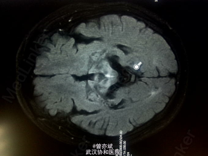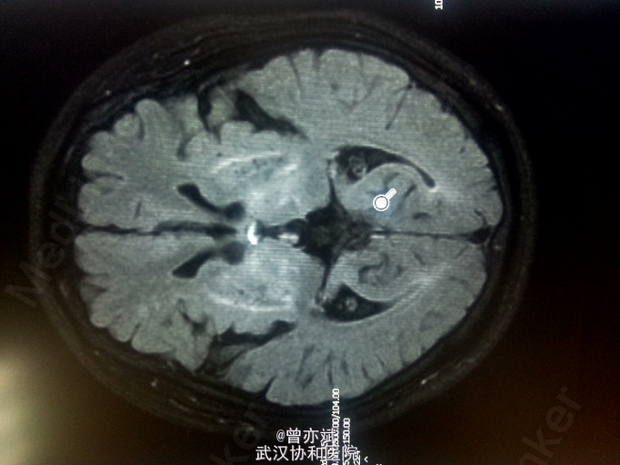 查体:T 36.4℃,P 77次/分,R 20次/分,BP 110/70mmHg。神志清楚,查体合作,皮肤及全身浅表淋巴结未及肿大,心肺腹未及明显异常,双下肢无水肿,生理反射存在,病理反射未引出。 专科查体:神清,吐词不清,语速减慢。双侧角膜可见K-F环,颅神经(-),四肢肌力正常,肌张力减低,左上肢不自主运动,姿势性震颤明显,腱反射对称性活跃,病理征未引出。感觉系统无异常。左手指鼻试验不准。Kernig征阴性。 辅助检查:血常规、尿常规、大便常规、大生化、ENA、ANCA、甲功五项、类风湿三项均阴性,铜蓝蛋白小于20mg/L(正常值220-580mg/L),叶酸、VitB12均正常。MRI平扫+增强 双侧基底节、丘脑、中脑及桥脑、双侧齿状核稍长T1稍高FLAIR信号及双侧苍白球、壳核及黑质信号改变,结合病史考虑肝豆状核变性;脑萎缩,尤以小脑桥脑明显。