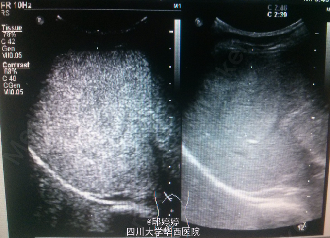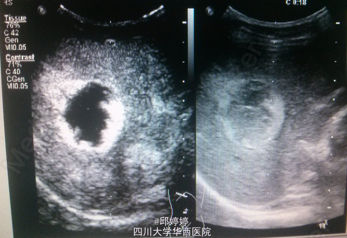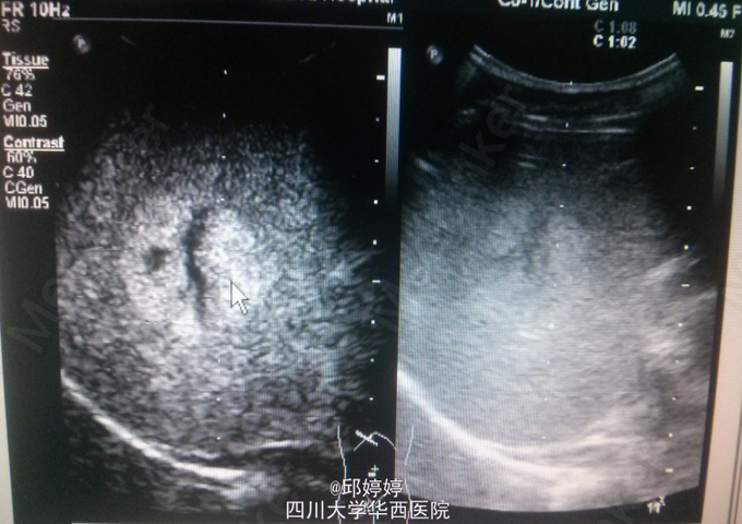 患者,男,36岁,体检超声发现肝内数个稍强回声团,较大位于右后叶,大小约5.0x3.7cm,上述团块边界清楚,形态较规则,较大者推挤右肝静脉,部分内部回声呈网格状;超声造影:团块动脉期呈环状结节样高增强(图1),门脉期持续向内充填(图2),实质期呈等增强(图3)。 讨论:血管瘤典型的超声造影表现特点明显,易于与其他良性或恶性病变相区分。