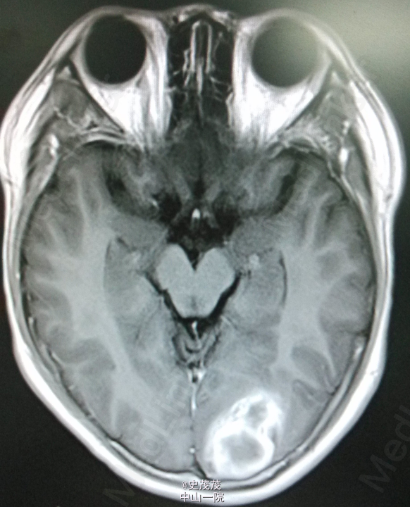 初步诊断:、左顶枕脑出血:动静脉畸形?肿瘤?。 治疗:因不能排除肿瘤出血,有介入栓塞禁忌症,故行开颅手术。术中未见肿瘤,见动静脉畸形,予切除,术后继续予脱水、止血、抗菌、营养脑神经等治疗。