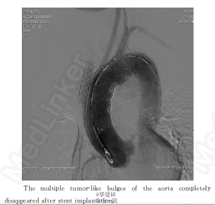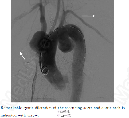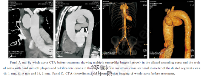 心超(上海长征医院2013年3月18日)升主动脉远端及主动脉弓起始部瘤样扩张,主动脉壁粗糙,轻度肺动脉高压伴三尖瓣返流。全主动脉CTA:升主动脉及主动脉弓见多发瘤样膨出,扩张管径分别为49.1、33.9和19.2 mm,全主动脉管壁内见软硬斑块,部分见钙化影见