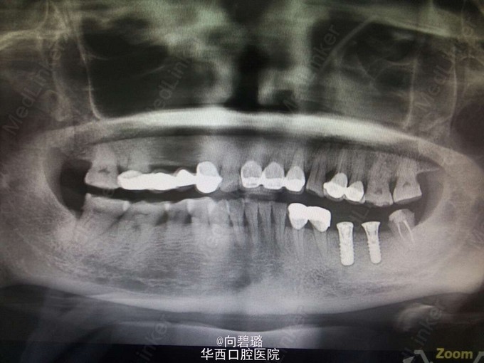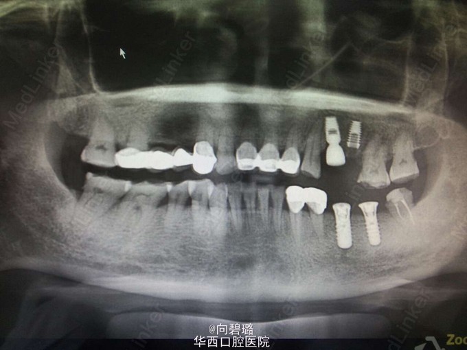 4个月后患者复诊,诉疼痛未缓解,拍片显示25牙根尖暗影变小,但未完全消除。 经患者本人考虑,在局麻下拔除24、25牙,行即刻种植手术。 随着显微超声技术和镍钛机动器械的发展,根管再治疗的成功率有了显著的提高。然而,由于根管再治疗相对于首次根管治疗病因复杂,去除根管充填物较困难,所以远期预后不佳,需要跟患者进行充分的沟通。