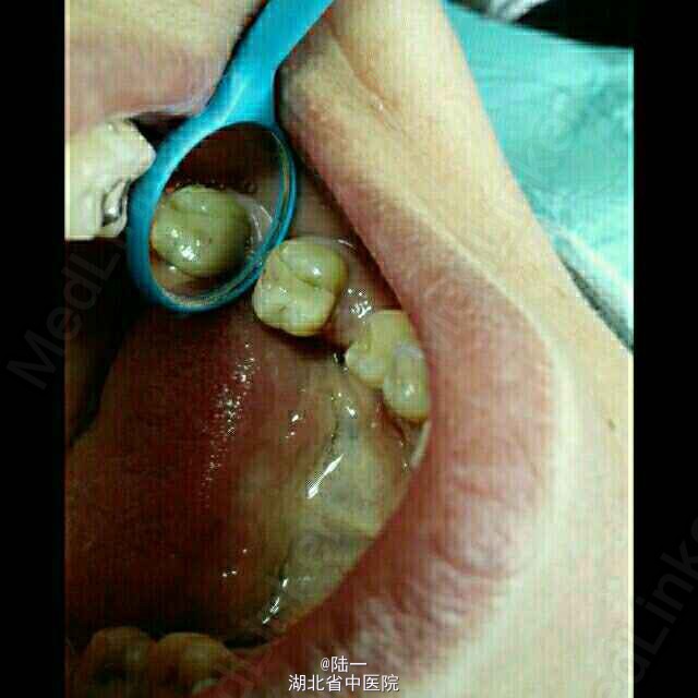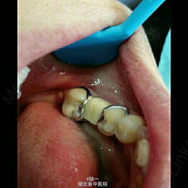颌面大面积龋坏,远中至龈下1mm ,原来银汞充填物部分脱落,活动修复体卡环固位差