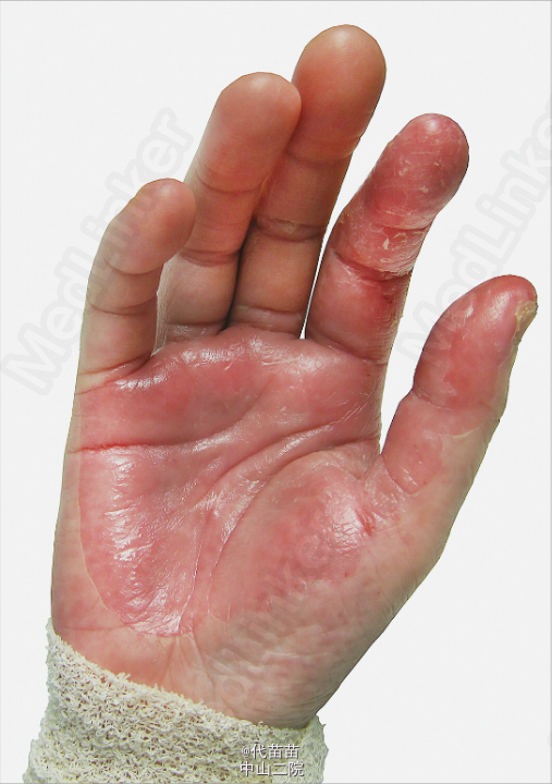 33岁女,发热伴腹痛4天,剖腹产术后7天。病人首先表现为弥漫性红皮病,入院第二天病情恶化,出现急性呼吸窘迫;随后病人的双手开始脱皮。