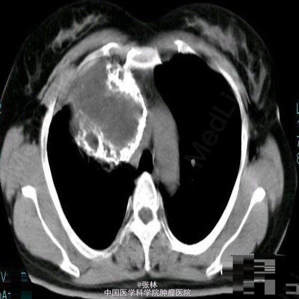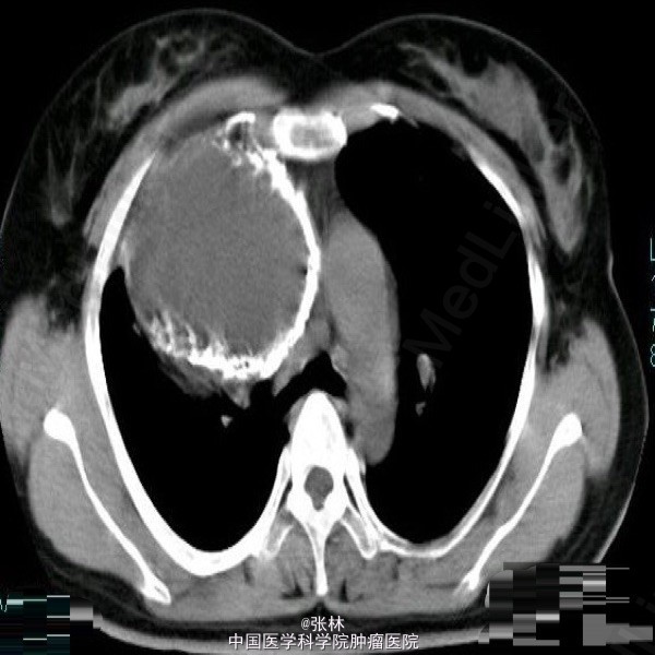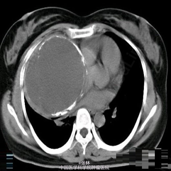 【临床病史】:患者,女性,37岁,运动后心慌、胸闷三年。右胸部呼吸音消失。叩诊呈实音。X线:右侧胸腔占位。 【影像表现】:右侧胸腔巨大囊性低密度影,大小约为109mmx118mm,边界清晰,边缘可见蛋壳样钙化,密度不均匀,CT值-35-420HU。 【影像诊断】:纵隔畸胎瘤 【最后诊断】:病理诊断:前纵隔囊性成熟性畸胎瘤。 【讨论】:畸胎类肿瘤分为囊性和实性两类,囊性畸胎瘤即皮样囊肿,多发生在前纵隔,CT为诊断该肿瘤最佳的影像学方法,可很好地显示肿块内的钙化、骨骼及脂肪成分。