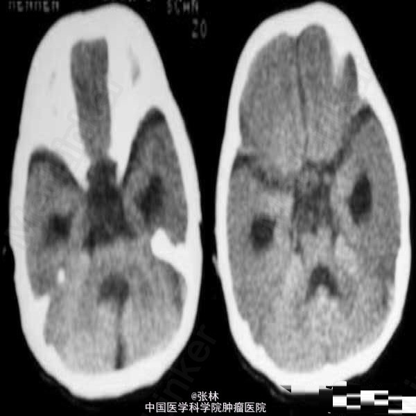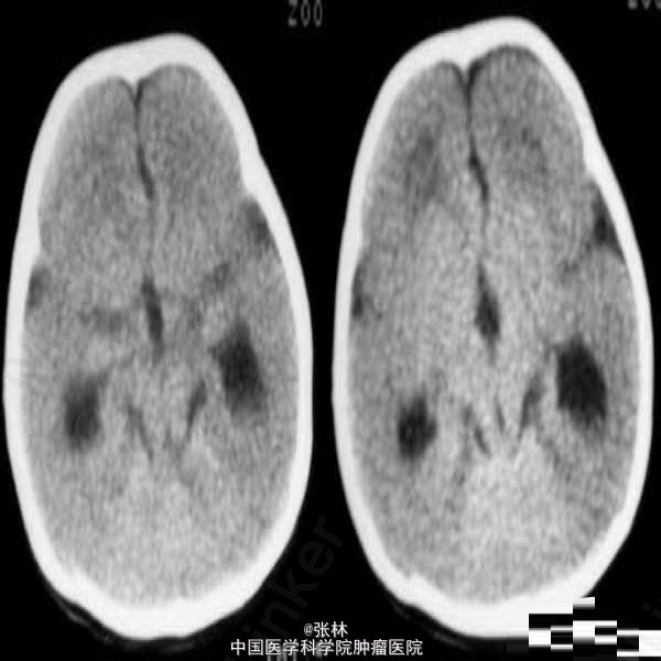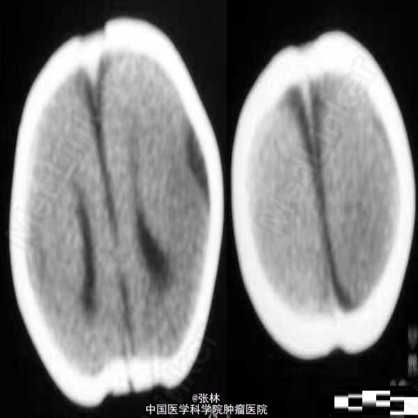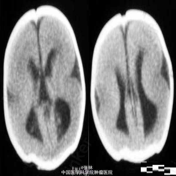 【临床病史】:患儿,F/0.5Y。癫痫,近一个月来频发。五官尚可,头颅大小与同龄儿相比稍小,智力低下(平时家人逗小孩时目光及动作迟缓)。 【影像表现】:显示双侧大脑半球皮层明显增厚、表面光滑、无脑回及脑沟,皮层下白质稀少。双侧外侧裂变浅、凹陷,整个双侧大脑半球呈“8”字形表现,脑室系统扩大。前纵裂增宽、增深,与第三脑室向连通。双侧侧脑室扩大、分离。 【影像诊断】:无脑回畸形伴胼胝体发育不良(Lissencephaly associated with Corpus Callosum dysplasia) 【诊断要点】:无脑回畸形伴胼胝体发育不良 【讨论】:无脑回畸形和/或巨脑回畸形:无脑回畸形指大脑表面光滑,无脑回结构;巨脑回畸形指大脑停留在原始阶段,脑回宽、扁。两者仅为畸形成度不同,可同时存在于脑的不同部位。前者多在顶枕部,后者多位于额部。镜下管前者大脑皮质结构异常,皮质分层不完全或不分层,常见不成熟的神经细胞。后者皮层保留了原始皮层的4曾神经细胞结构,神经细胞分化不成熟。白质中常发现异位的神经细胞,有时呈结节状。 [临床表现] 无脑回畸形患儿在新生儿期常有小头畸形和轻微面部异常,以后表现出智力落后。完全性无脑回畸形者大多在2岁前死亡。巨脑回存活者常有智力低下和癫痫。 [CT表现] 无脑回畸形和/或巨脑回畸形,前者主要表现为脑表面光滑,脑回、脑沟消失,皮层增厚,白质减少。后者主要表现为侧裂变浅、增宽,脑回增宽,皮质增后,内表面光滑,白质减少,患侧脑室系统扩大。此外,无脑回畸形两侧裂变浅,呈“8”字形表现。