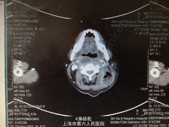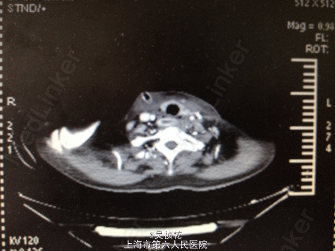 患者发现左侧颈部肿大20余天,吞咽困难伴红肿发热。 患者于20天前因左侧颈部肿大,伴红肿热痛,来我院门诊就诊。当时门诊血常规:WBC:16.9×109/L,N:84.5%,RBC:4.4×1012/L,Hb:140g/L,PLT:133×109/L。颈部超声示:双侧颌下淋巴结肿大,左侧颈后软组织结构紊乱,内混合回声及肿大淋巴结,考虑炎性改变可能,建议治疗后复查。后经门诊抗炎治疗后症状未见明显好转,近一周出现吞咽困难,再次来院就诊,门诊查颈部CT:1.咽后间隙、左侧咽旁间隙及颈动脉鞘软组织明显肿胀、渗出,颈部多发肿大淋巴结,考虑炎症可能大,请结合临床并门诊增强CT评估。2.左侧甲状腺小结节可能,请结合临床,必要时随访。为进一步诊治门诊以以“颈部脓肿,2型糖尿病”收住入院。追问病史:患者既往有糖尿病病史2年,平素未予任何治疗,未测血糖。