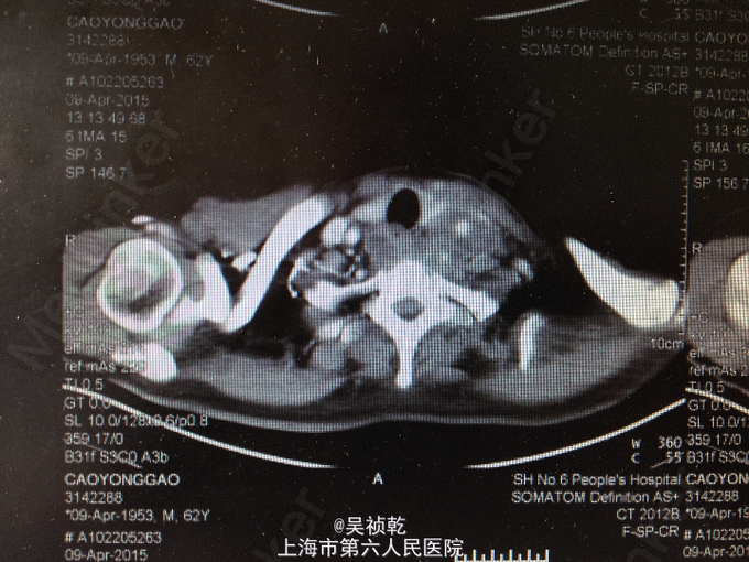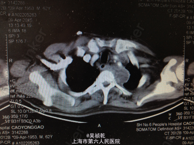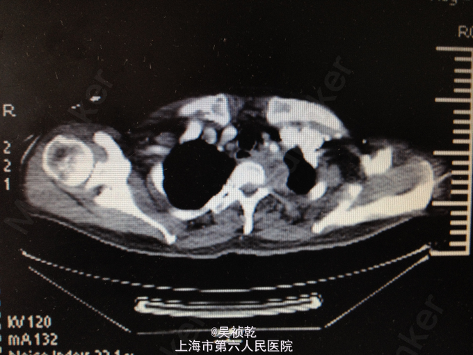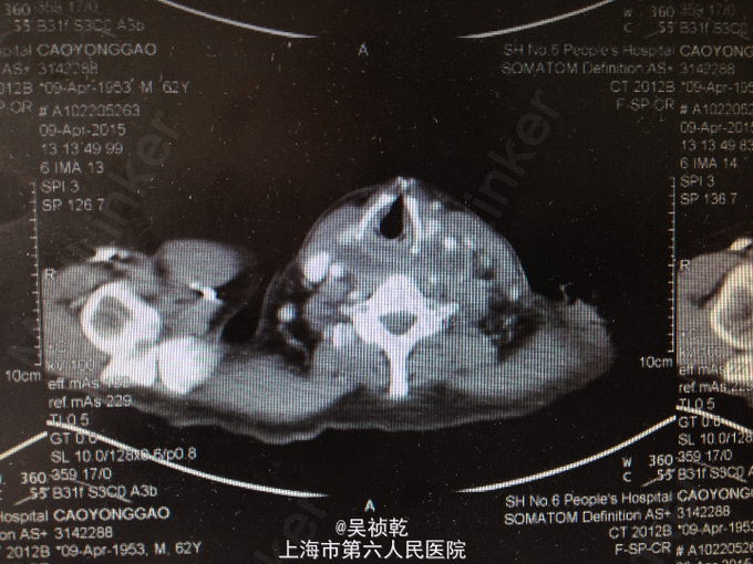 本患者为糖尿病患者血糖控制不佳导致的颈部巨大脓肿,因治疗不及时,导致感染扩散,形成咽部,颈部,纵膈脓肿形成,压迫食道导致吞咽困难,病情凶险,经积极手术治疗后患者病情稳定,已恢复进食,引流管引流中,待时机成熟拔除。针对本例患者的经验是及早对症抗炎,控制血糖,必要时及时手术切开引流,待脓肿大量形成后必须行脓肿清创引流,否则患者随时有生命危险。