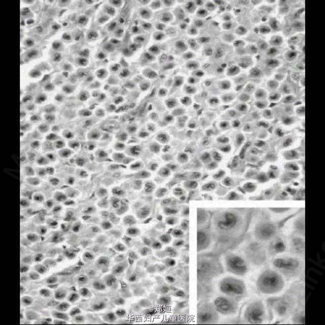 肉眼观肿块直径3cm,部分覆盖有皮肤,切面灰褐色。