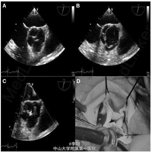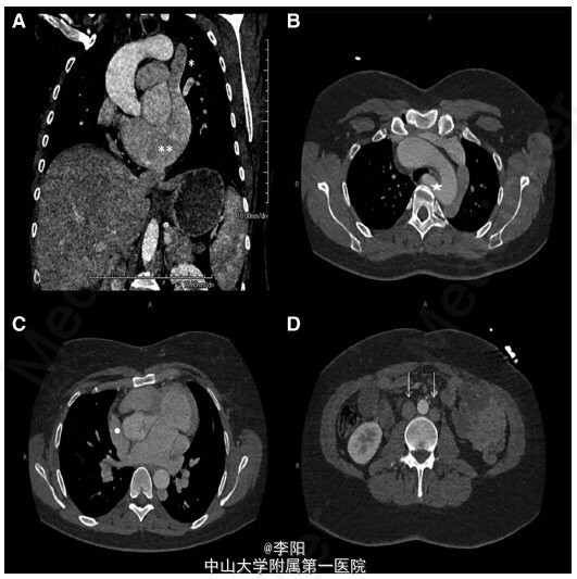 患者,女,35 岁,因车祸入院,既往曾行直肠阴道瘘修补术,诉劳力性呼吸困难多年。面部特征表现为双侧耳前凹陷、脸部不对称。查体提示左侧第二肋间舒张期杂音。血常规、心电图、胸片均未见异常。超声心动图提示升主动脉扩张(39mm),主动脉瓣重度反流。经食管超声心动图提示四叶式主动脉瓣(图 1A-1C)。增强 CT 显示双下腔静脉系统、半奇静脉及持续性上腔静脉异常,冠状动脉窦动脉瘤并主动脉四叶瓣 (图 2A-2D)。