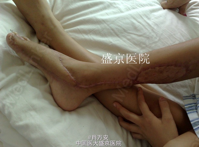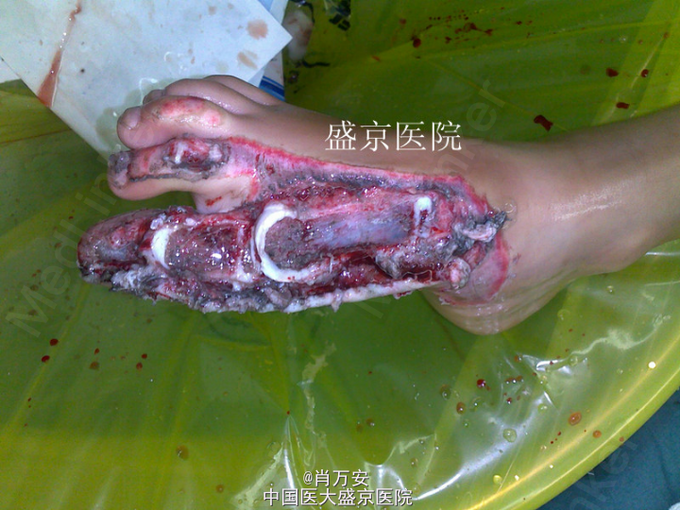 女患,10岁,车祸致右足内侧毁损4小时入院。该患者4个小时前右足被汽车车轮碾压致伤。