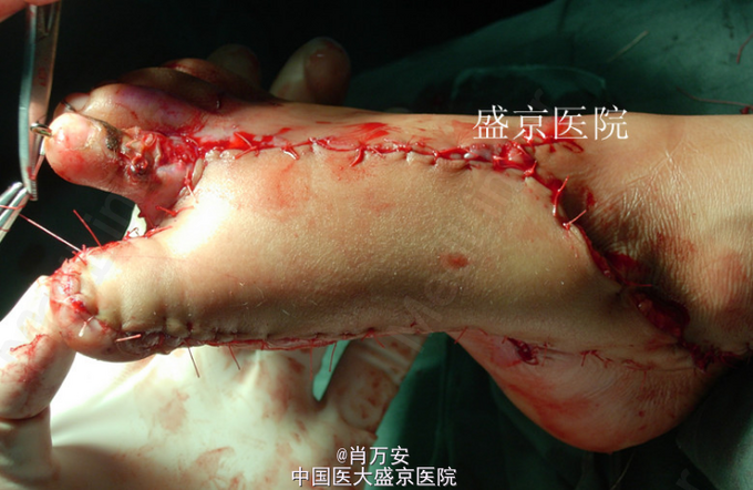 诊断:右足前内侧毁损伤,皮肤软组织缺损 处理:一期清创、VSD覆盖,控制感染。伤后10天,拆除VSD,见创面较清洁,无感染,行小腿内侧带胫后动脉皮瓣修复创面,皮瓣成活后患者出院。