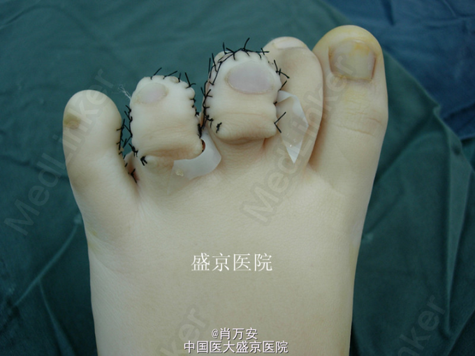诊断:左足三四趾巨趾症 处理:足趾远端行U形切口,将趾甲及甲床从远节趾骨分离,形成甲皮瓣,向近端推移至上一趾骨,远节趾骨切除,切除病变趾神经及纤维脂肪组织,缝合固定。