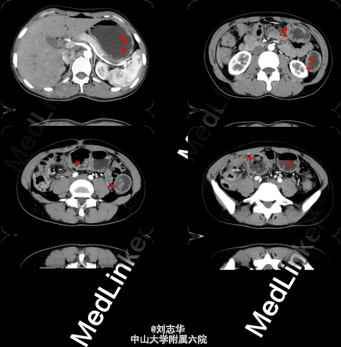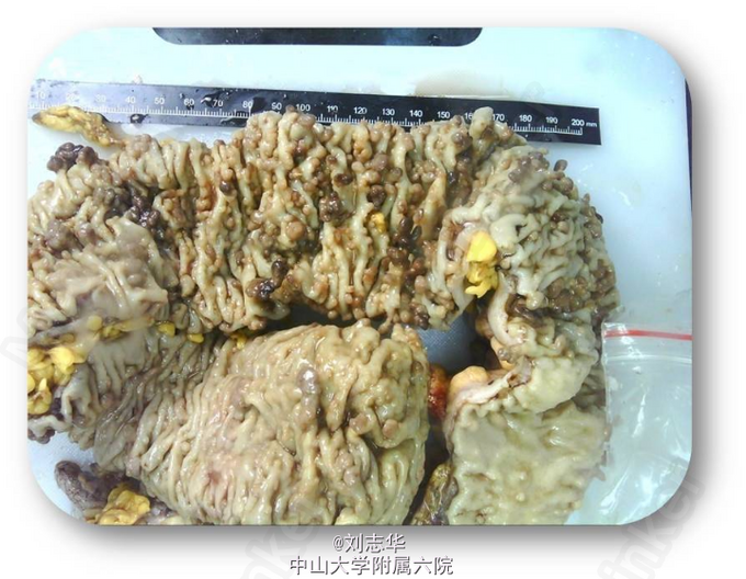 专科检查:腹壁平坦,呼吸运动正常, 无皮疹、条纹、疤痕、包块,无腹壁静脉曲张,未见胃肠型及蠕动波。 腹软,无压痛、无反跳痛、腹部肿块未触及。肝脾肋下未触及,肝区双肾区无叩痛,腹部移动性浊音阴性,肠鸣音正常,4次/分。肛检: 左侧卧位:肛门指检可及直肠多个小肿物,大小约0.2-0.5cm,表面光滑,指套无血染。 肠镜:全结直肠多发息肉(数目大于100枚);痔。 胃镜:胃多发息肉。 胸腹盆增强CT:胃内、所示左半横结肠-直肠弥漫多发息肉。