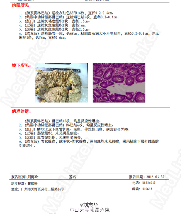 患者“体检发现结直肠多发息肉3年”入院。3年前于当地医院行“混合痔”术时发现直肠息肉,后肠镜检查发现结直肠多发息肉。2012年5月,在我院消化内科就诊行息肉钳除术,病理:绒毛-管状腺瘤,伴灶性高级别上皮内瘤变。 2012年8月,再次行肠镜息肉钳除,病理示管状腺瘤。为进一步治疗到我院就诊,患者无腹痛、腹胀,无恶心及呕吐,无里急后重感,大便正常,无血便,无发热。门诊拟“结直肠多发息肉”收治入院。
