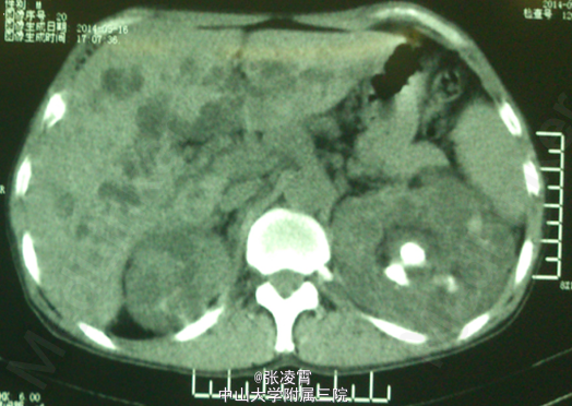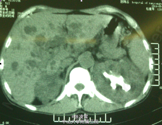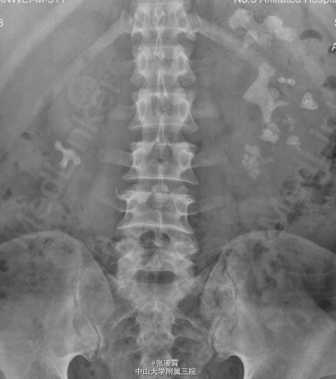患者男性,51岁,因“左侧腰部胀痛不适20天余”入院。患者20余天前无明显诱因出现左侧腰部胀痛,未伴有发热,寒战,恶心,呕吐,轻度尿频,尿急,尿痛等不适,至柳州市工人医院就诊,尿蛋白+2g/L,潜血阳性,WBC(++),血红蛋白69g/L,肌酐450umol/L;KUB示双肾多发结石,双肾ECT示左肾GFR21.09ml/min,右肾8.84ml/min,考虑为双肾多发结石伴左肾及肾周感染,慢性肾功能不全,尿路感染,肾性贫血,经抗炎等对症治疗后,症状有所缓解。 实验室检查:尿常规:白细胞计数98http://www.medlinker.net/m/casem/12628336计数12.3个/μL,血常规:血红蛋白计数:64g/L。血生化:碳酸氢盐12.0mmol/L,肌酐443μmol/L。凝血四项未见明显异常。 影像学检查:KUB示:双肾多发结石,左侧为著,部分为铸型结石(图1)。外院CTU示:多囊肾,多囊肝,双肾结石(图2、3)。