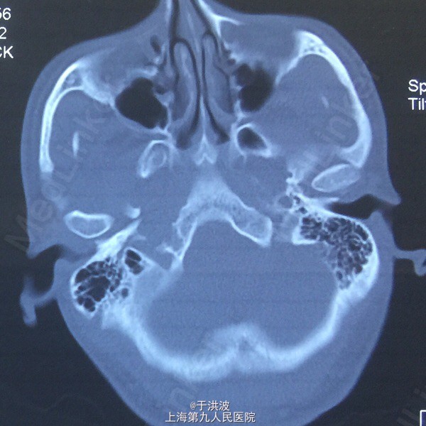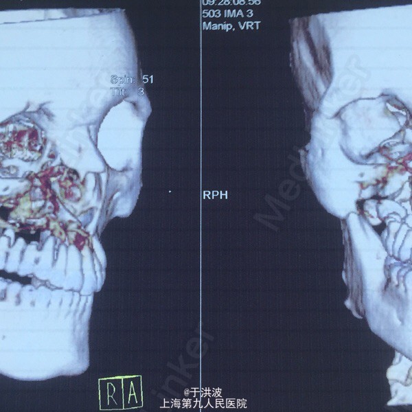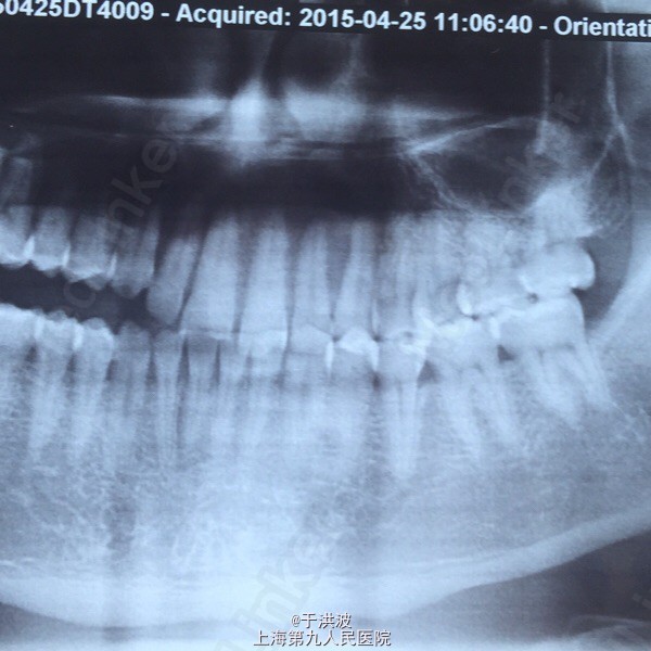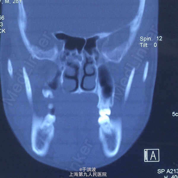 面部基本对称,右侧面部无明显膨胧,无压痛。口内右侧上颌前庭沟黏膜无异常,右侧上颌牙列松动,牙列上移,与下颌牙无咬合接触。CT示右侧上颌骨弥散性吸收。血常规未见异常
