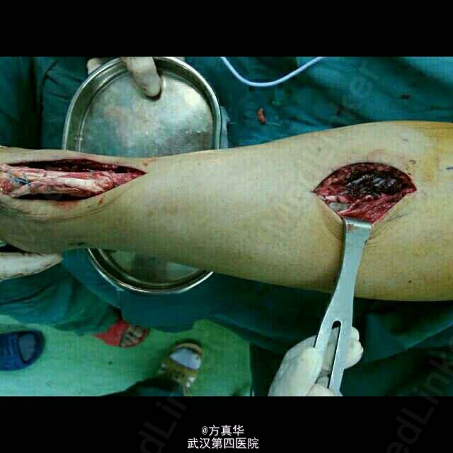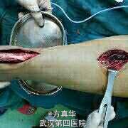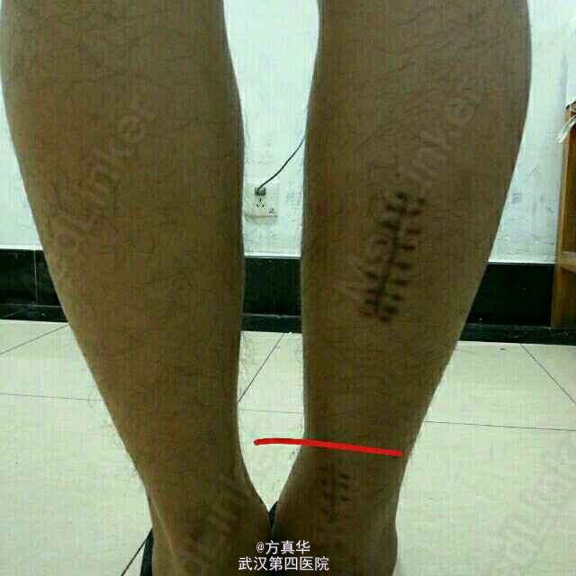 患者,36岁因右足行走后疼痛3月入院 查体,右Thompson阳性,提鍾不能 诊断陈旧性跟腱断裂, 行改良的腓肠肌腱膜微创修复