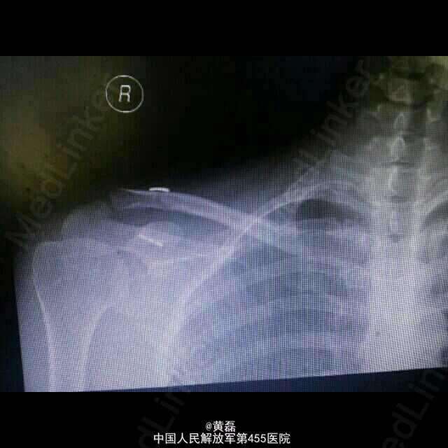 诊断:1、右肩锁关节脱位;2、右肩锁、喙锁韧带断裂;3、右冈上肌、三角肌、斜方肌损伤。择期行袢钢板喙锁韧带重建手术治疗。