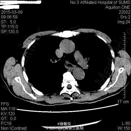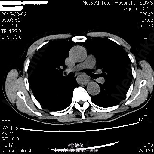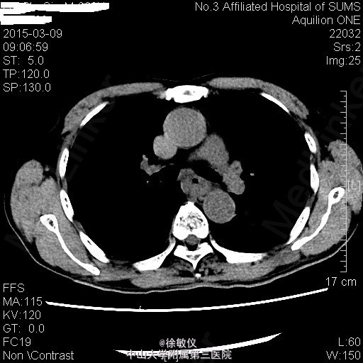 查体:无特殊。 胸部CT平扫+增强:中段食管癌,部分层面与胸主动脉分界欠清;纵隔多发小淋巴结。