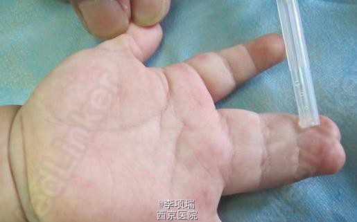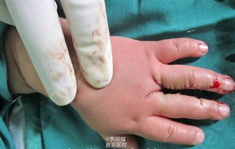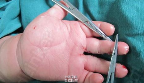 分手指,采用减脂的方式后缝合。术后复诊,中指有一些挛缩,又做了松解植皮术。