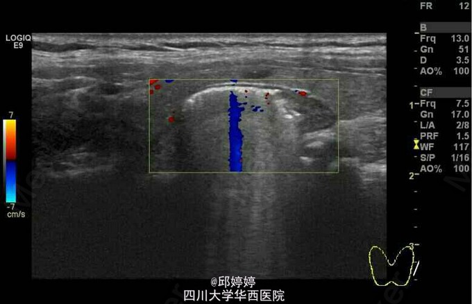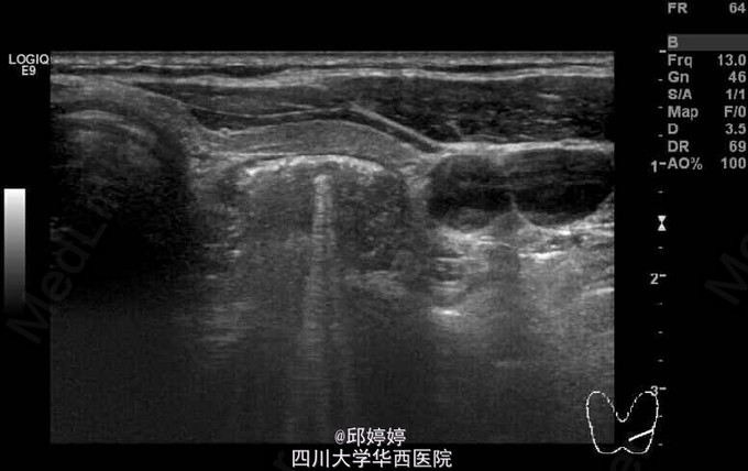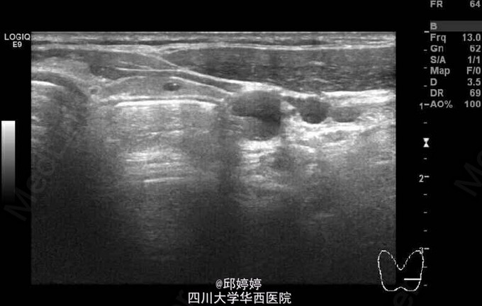 患者,女,60岁,无特殊不适,行常规体检。超声检查发现患者颈部甲状腺左侧叶后方查见大小约23x9mm的杂乱回声团,内可见气体样强回声,后方回声衰减(图1-3)。 诊断:食管憩室。 此种现象较为少见,应注意与甲状腺本身的病变相区别,以防误行进一步的穿刺活检而导致食管损伤。