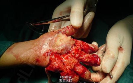 术中松解瘢痕,注意保护血管神经肌腱不外露,掌心粘连也同时松解到完全伸直位.开大指蹼,植皮。