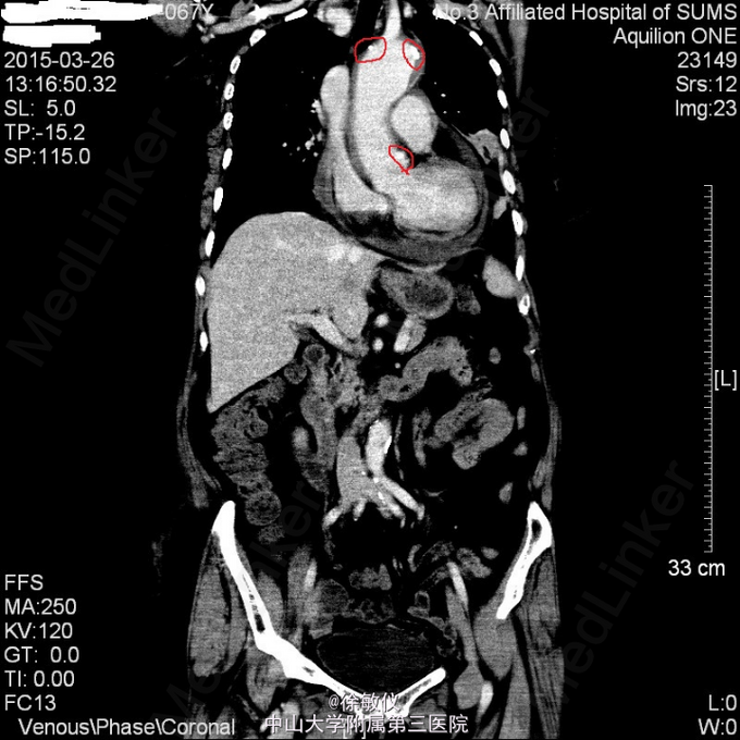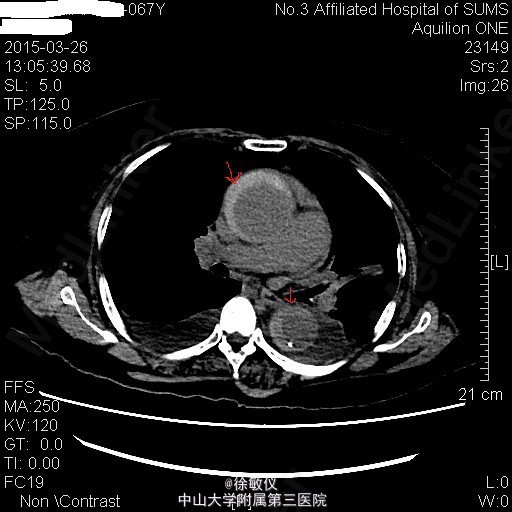 讨论:典型的急性主动脉夹层病人往往表现为突发的、剧烈的、胸背部、撕裂样疼痛。严重的可以出现心衰、晕厥、甚至突然死亡。该患者仅表现为胸闷,症状不典型。