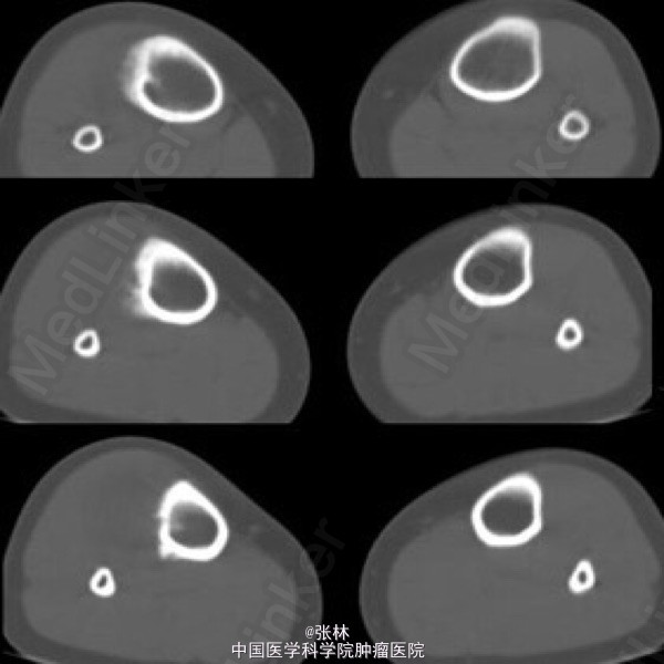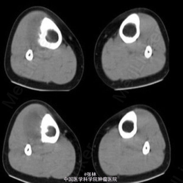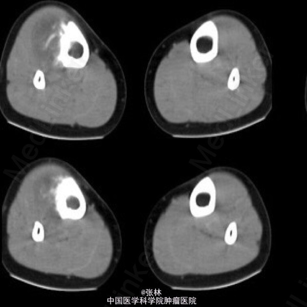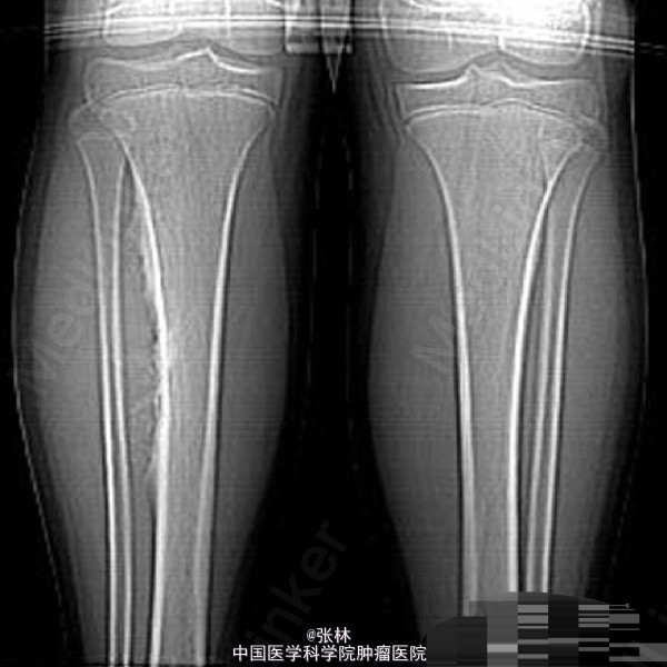 影像表现:右胫骨外侧骨皮质表面低密度软组织肿块,与骨干长轴平行,基底部有条状钙化影,肿块边缘有骨膜新生骨,骨皮质内面未受侵犯,肿块与骨皮质间无透亮间隙。
