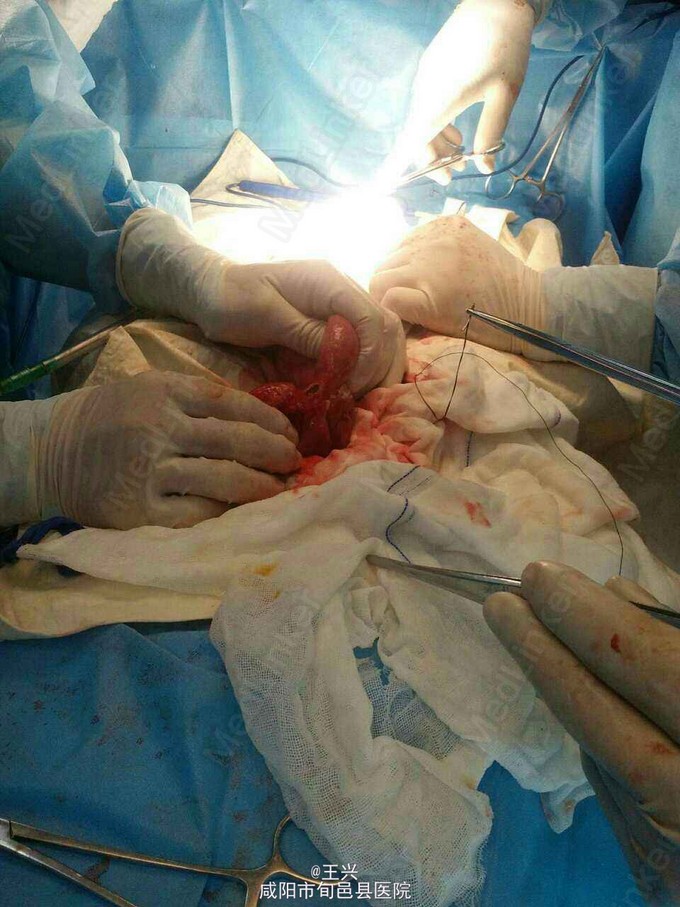诊断:肠破解,弥漫性腹膜炎,粘连性肠梗阻。 急诊行肠粘连松解、肠减压修补腹腔冲洗引流术。术后恢复良好,痊愈出院。