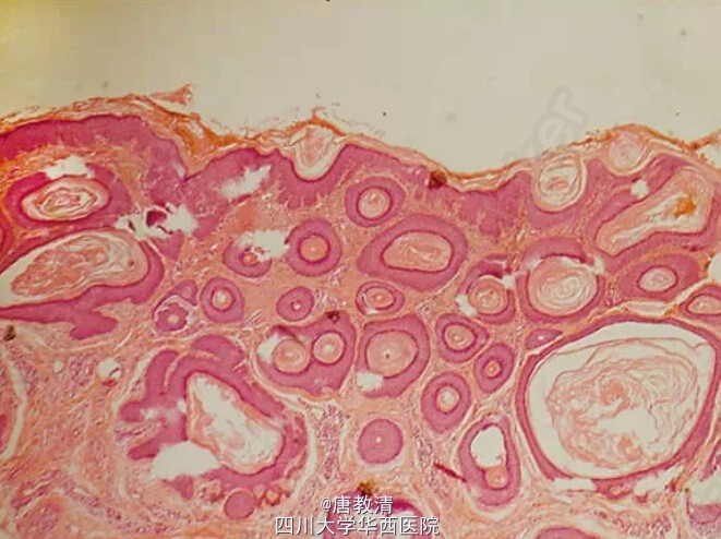 予手术切除。术中所见:切至约0.5cm处见大量的皮脂腺增生,可挤出较多白色奶酪样物质。 诊断:毛发腺瘤。