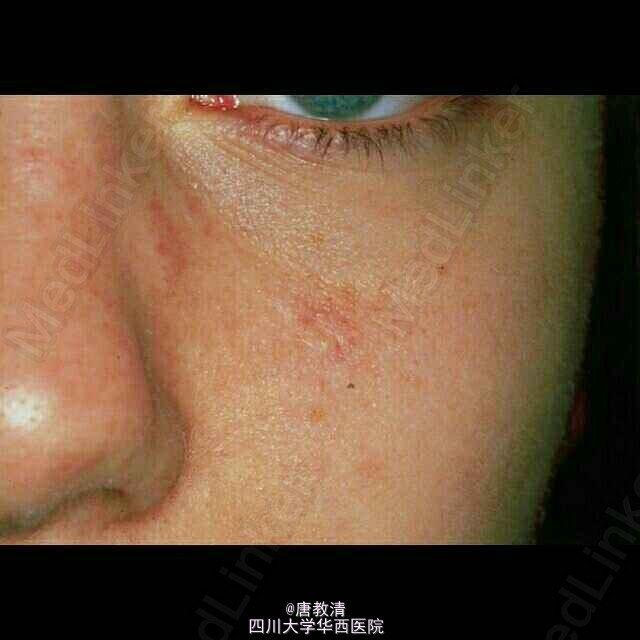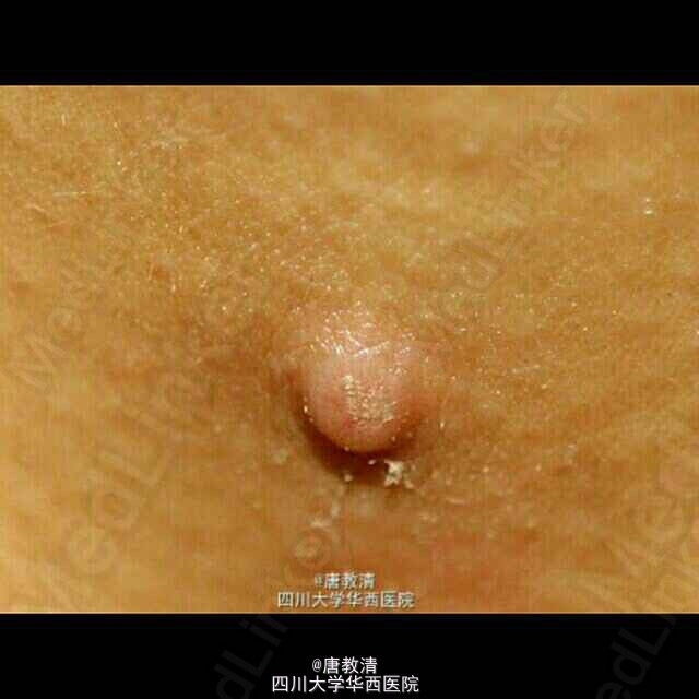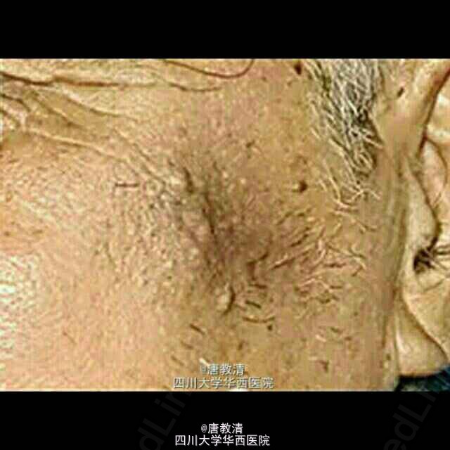 皮肤科检查:左颧部一约2.5cm×2.5cm结节,质中等,稍隆起,与周围组织无明显粘连,活动度好,无破溃,皮色较周围皮肤深,表面可见多个大小不等的淡黄色丘疹。
