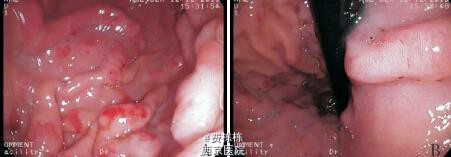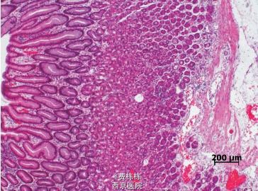 入院后给予抗感染(更昔洛韦、头孢美唑)、输注白蛋白(总量 1 g/kg,入院 1 周内分 3 次输注)及利尿等治疗,患儿水肿消退,腹痛及呕吐缓解 ,颈部淋巴结缩小,扁桃体分泌物消失。进一步行全身麻醉下电子胃镜及结肠镜检查,发现胃底及胃体黏膜明显充血水肿,呈结节样肥厚、隆起,其表面可见糜烂,质脆易出血,较多白色黏液覆盖黏膜表面;食管、贲门、胃窦、胃角、幽门、十二指肠球部未见异常。结肠镜检查未见异常。取胃窦及胃体黏膜活检,提示胃窦黏膜组织呈慢性炎症改变,嗜酸粒细胞约 1 个 /HPF;胃体黏膜上皮呈管状腺瘤样增生,固有膜及黏膜下层水肿明显,并见散在的炎性细胞浸润,嗜酸粒细胞最多约 15 个 /HPF,免疫组化检查示幽门螺杆菌(Hp)阴性,CMV 阴性。之后给予洛赛克抑酸、吉法酯保护胃黏膜等治疗。入院后第 16 天复查肝功能全套(9 项)TP 64.4 g/L,ALB 35.8 g/L,GLB 28.6 g/L,均较入院时升高,白蛋白仍低于正常值,电解质及血液分析未见异常。入院第 26 天在全麻下行超声胃镜检查,提示胃体可见多处的第二层无回声性增厚,最厚处达 5.8 mm,胃部周围未见明显增大的淋巴结。考虑诊断“蛋白丢失性胃病”(protein-losing gastropathy, - PLG)。