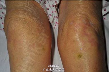 诊断为左房黏液瘤伴少酸链球菌心内膜炎。病情稳定后,予静脉注射青霉素 G(1.2g/4h)和红霉素(12.5mg/kg/6h),并建议行心脏外科手术,但根据患者及家属意愿以及患者存在的合并症和一般情况,最终未行手术治疗。静脉抗生素治疗 6 周后,患者感染控制良好,网状青斑消失,医嘱予出院,3 个月后无病情反复。