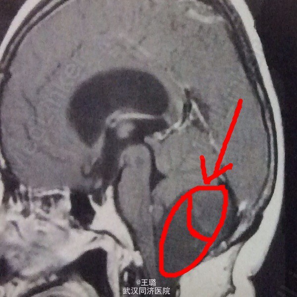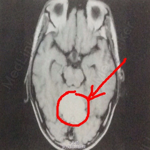 体格检查:体温37.5度,HR:73bpm,血压正常,面部检查眼球水平震颤阳性,颈项强直症阴性。神经反射正常,病理反射未引出。 实验室检查:血常规红细胞降低,血红蛋白白蛋白下降,胆红素正常。 影像学检查:CT示:小脑蚓部有一均匀高密度信号,边缘光滑,略有分叶。MRI示:T1WI显示病灶绝大部分为均匀高信号,与皮下脂肪相近,后部小部分为低、等混杂信号。