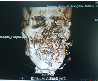 患者面部组织大面积破损并伴出血,CT显示上颌骨粉碎性骨折,左颧骨颧弓骨折,15-25牙缺失,下颌骨部分粉碎性骨折伴骨缺损。