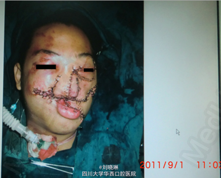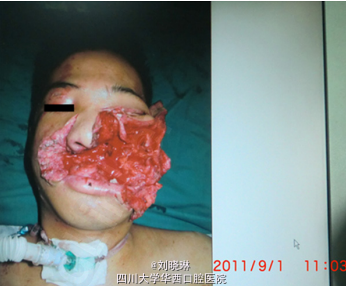 患者男,17岁,因近距离遭受火器伤导致面部严重损害以及大出血,已进行静脉滴注,输血止血和紧急气管切开等