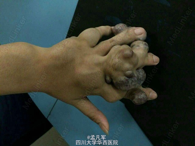 左手多发包块,色暗红,触之流血,进行性长大