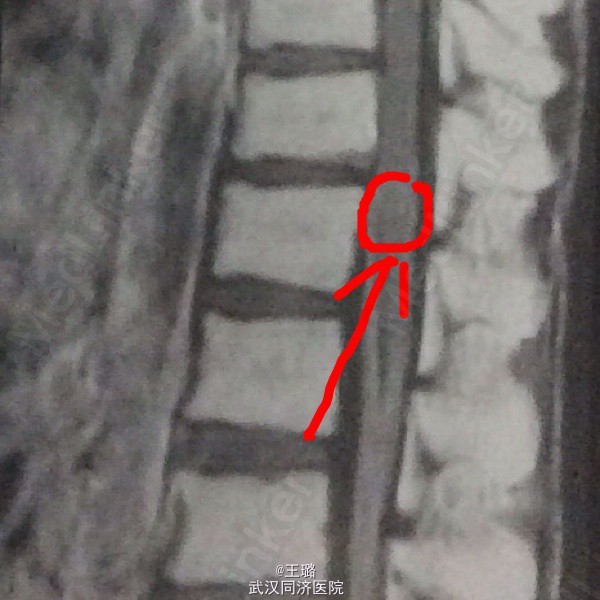 预后:一周后,右侧肢体逐渐恢复。大小便自主性逐渐恢复正常。 讨论:患者既往有结核病史,但髓内结核球罕见,多为血行播散,72%的病变位于胸髓。需与室管膜瘤和脊髓转移瘤鉴别。