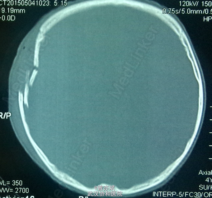 查体:右侧颞顶部头皮软组织肿胀,清创缝合术后。于查体无特殊。CT如下