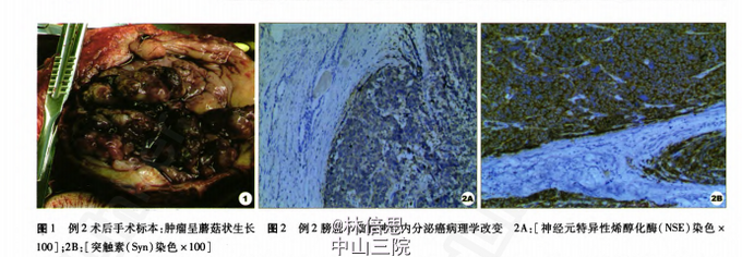诊断:(1)膀胱恶性肿瘤(移行细胞癌Ⅲ级);(2)前列腺癌术后;(3)(双侧)输尿管扩张、积水;(4)冠心病;病;在全麻下行根治性膀胱全切术、双侧输尿管皮肤造口术(图1)。术后病理报告:膀胱神经 内分泌癌Ⅲ级(G3),侵犯浆膜层,可见血管内瘤栓,前列腺萎缩并可见肿瘤侵犯,双侧输尿管残端及尿道残端未见肿瘤浸润(图2)。免疫组化结果:CK20(2+)、CK7(一),前列腺特异性抗原(PSA)(一),Ki-67>50%、NSE(3+)、Syn(3+)。