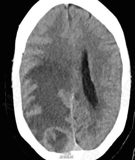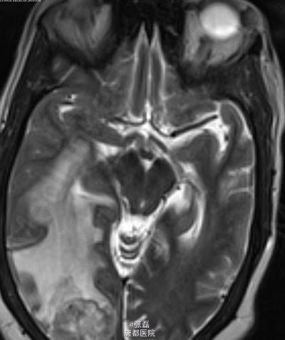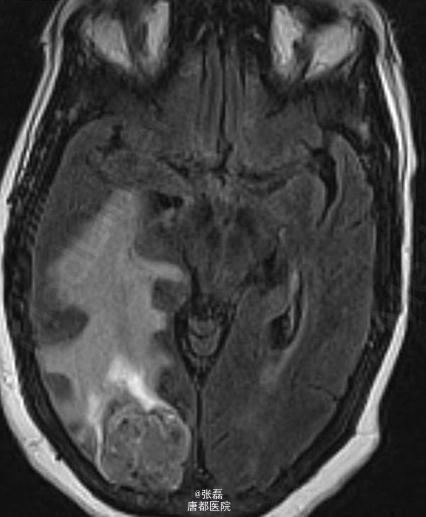 颅脑平扫 CT 显示右侧枕叶肿块,其内密度不均,中间呈低密度。周围脑组织呈血管源性水肿性低密度,邻近脑沟、裂变窄变浅,右侧侧脑室受压变形。 颅脑平扫加强化 MRI 显示:右侧枕叶见一长 T1 等长 T2 异常信号,FLAIR 呈高信号,注入对比剂后呈明显不均质强化,中间呈坏死性不强化改变。病变强化后边界不清,邻近脑实质和后方软脑膜受侵。病变定位脑内,非硬脑膜起源,未见脑膜尾征。周围脑组织可见血管源性水肿征象,累及皮层下和深部白质。MRI 显示较 CT 清晰、明显。 病理诊断:脑转移瘤