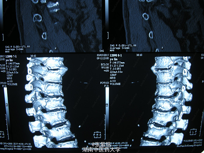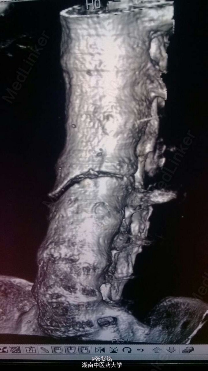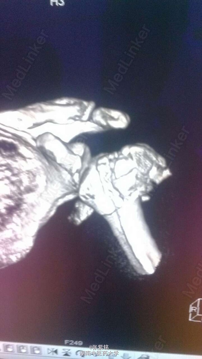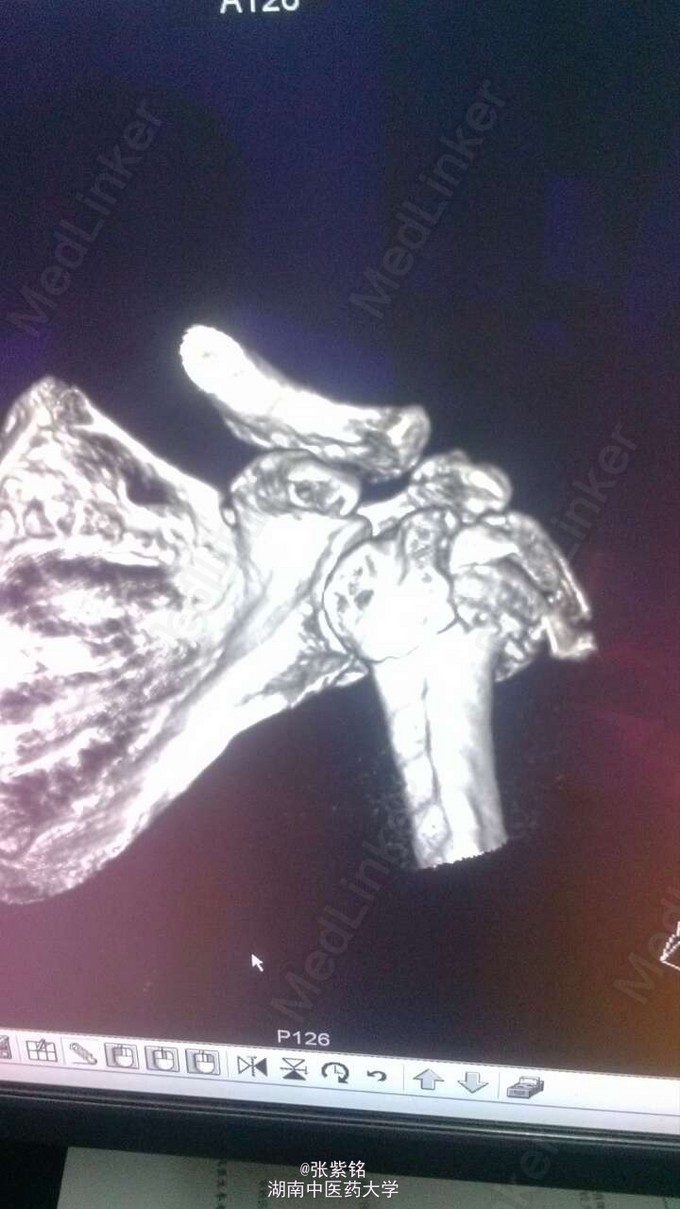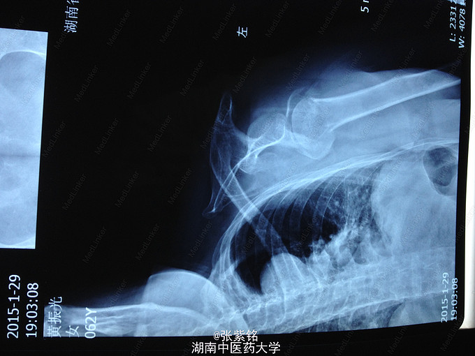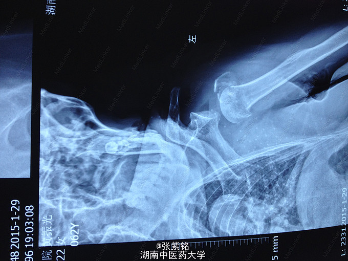 查体见:左额部可见约2cm*2cm皮下血肿,并可见一不规则伤口约2cm,伴活动性出血。脊柱驼背畸形,胸椎后凸,头部前伸体态;颈、腰部旋转活动不能,腰部于L3-5椎体棘突处压痛明显,双下肢肌力、肌张力正常。左肩部关节明显肿胀,可扪及空虚感;局部压痛明显,左Dugas征阳性,左肩关节主动上举,外展,后伸,内收活动受限;被动活动患处疼痛加剧,左侧桡动脉搏动可扪及,皮肤感觉正常,左肘、腕及各指间关节血运感觉活动正常。 X线片示:左肩关节脱位,左肱骨外科颈骨折,左肱骨大结节撕脱性骨折。