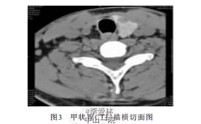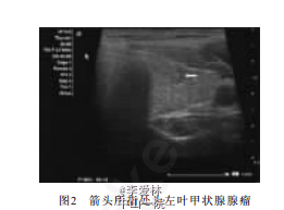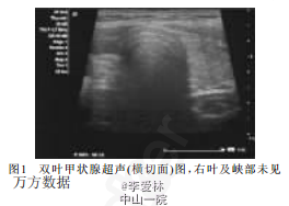 超声所见:于颈部行多切面扫查,气管右侧及前方均未见甲状腺回声(图1),仅于左侧探及甲状腺 回声,大小约2.2ncm×1.7ncm×1.5ncm,边界清晰,实质回声欠均匀,内可见一低回声结节,大小约0.9n cm×0.9n cm(图2)。 超声诊断:①甲状腺先天发育异常(右叶及峡部缺如)。②甲状腺左叶多发结节;后经CT扫描确诊右叶甲状腺及峡部未见(图3)。 ③左叶甲状腺腺瘤。