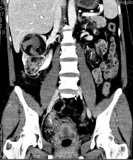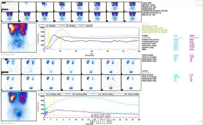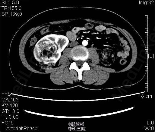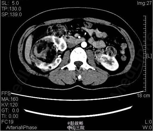 3、既往史:无特殊 4、体格检查:双肾区无红肿、隆起,左肾区叩击痛(-),右肾区叩击痛(+),左侧肋脊点、肋腰点压痛(-),右侧肋脊点、肋腰点压痛(+)。腹平软,左侧输尿管走行区压痛(-),右侧输尿管走行区压痛(-),膀胱区无膨隆,压痛阴性。 5、辅助检查:尿常规:白细胞计数27.60个/ul; 生化全套:钾3.290mmol/L;血常规:白细胞总数12.730x10E9/L,中性粒细胞绝对值9.950x10E9/L心电图、胸片正常;肿瘤抗原检查正常。ECT:右肾灌注、功能轻度降低;左肾灌注、功能基本正常。GFR:左肾为67.3ml/min,右肾为30.6ml/min。CTU:右肾体积增大,双肾可见多发大小不等结节状、团块状异常密度影,其内密度欠均匀,病灶内可见脂肪密度影,增强扫描呈不均匀强化,最大者位于右肾,约59×54mm,双肾多发错构瘤,右肾错构瘤出血。