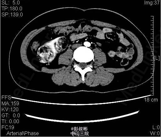 1、主诉:突发右侧腰部疼痛1天余。 2、病史:患者于1天前无明显诱因起床时突发右侧腰部疼痛,呈钝痛性质,疼痛局限于右腰部,无放射性,伴恶心,呕吐,无肉眼血尿,无腹痛,1周前到东莞市人民医院住院治疗,查B超:右肾实质内混合性回声光团,左肾下部稍高回声光团。CT 平扫:右肾肿物破裂出血可能,左肾肿物。现为进一步诊治收入我科。精神、睡眠、胃纳可,体重无明显变化。