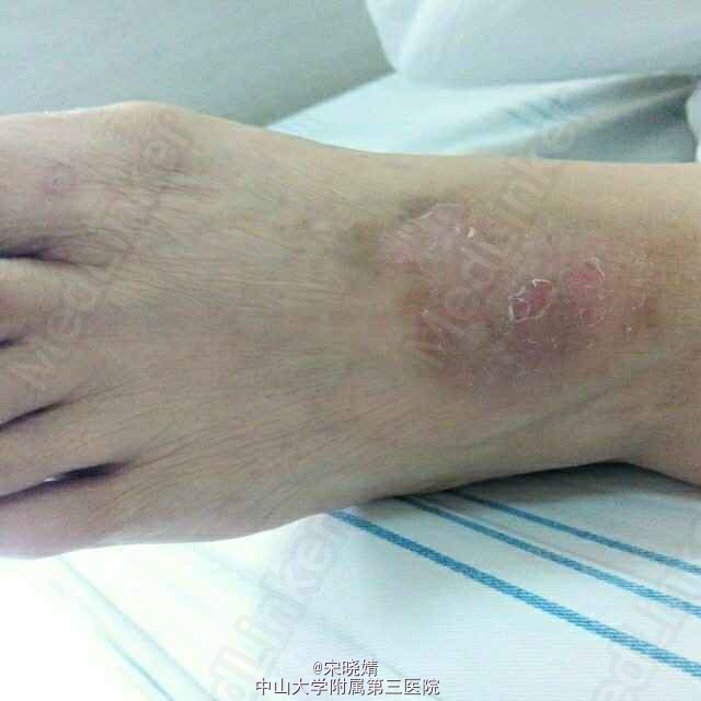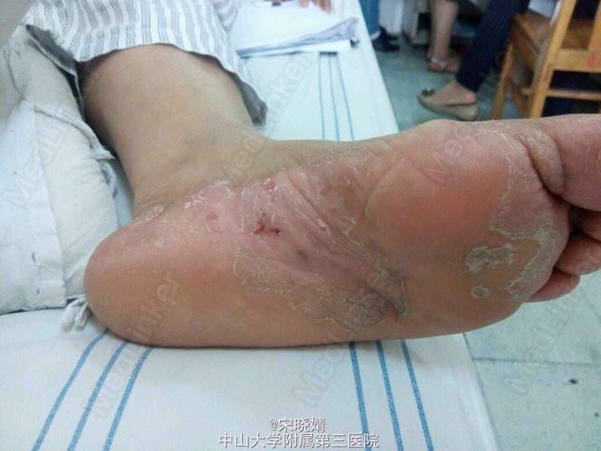 复发性丹毒。治疗上予青霉素及外用适当剂型护理。另加强局部及系统抗真菌治疗,避免丹毒复发及引起硬化性脂膜炎。