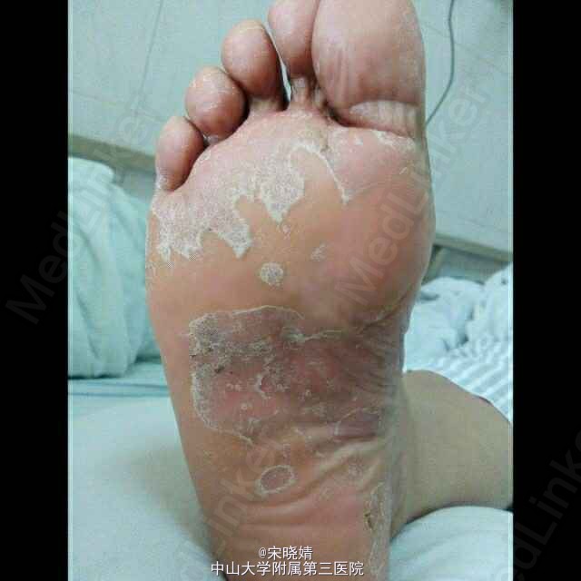 双小腿弥漫性暗红斑,局部肿胀,边界较清,表面覆盖大量黄褐色痂皮,少量糜烂面。双足趾缝可见白色浸渍及白色脱屑。全身浅表淋巴结未触及。